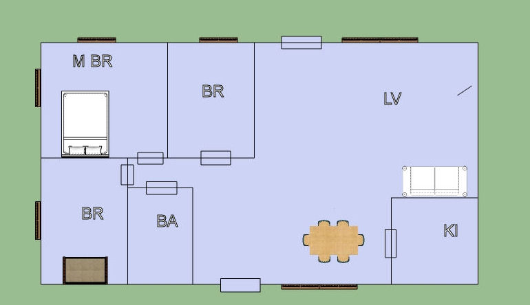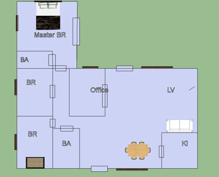 This was our sketch, thanks to Google Sketchup. We then thought adding a master bedroom off the current master and making one of the bedrooms an office leading out to the living room may be the best way to go! Here was our proposed: