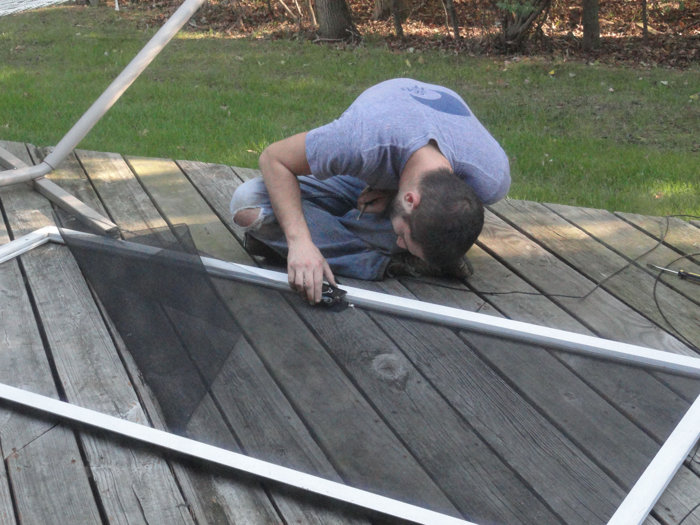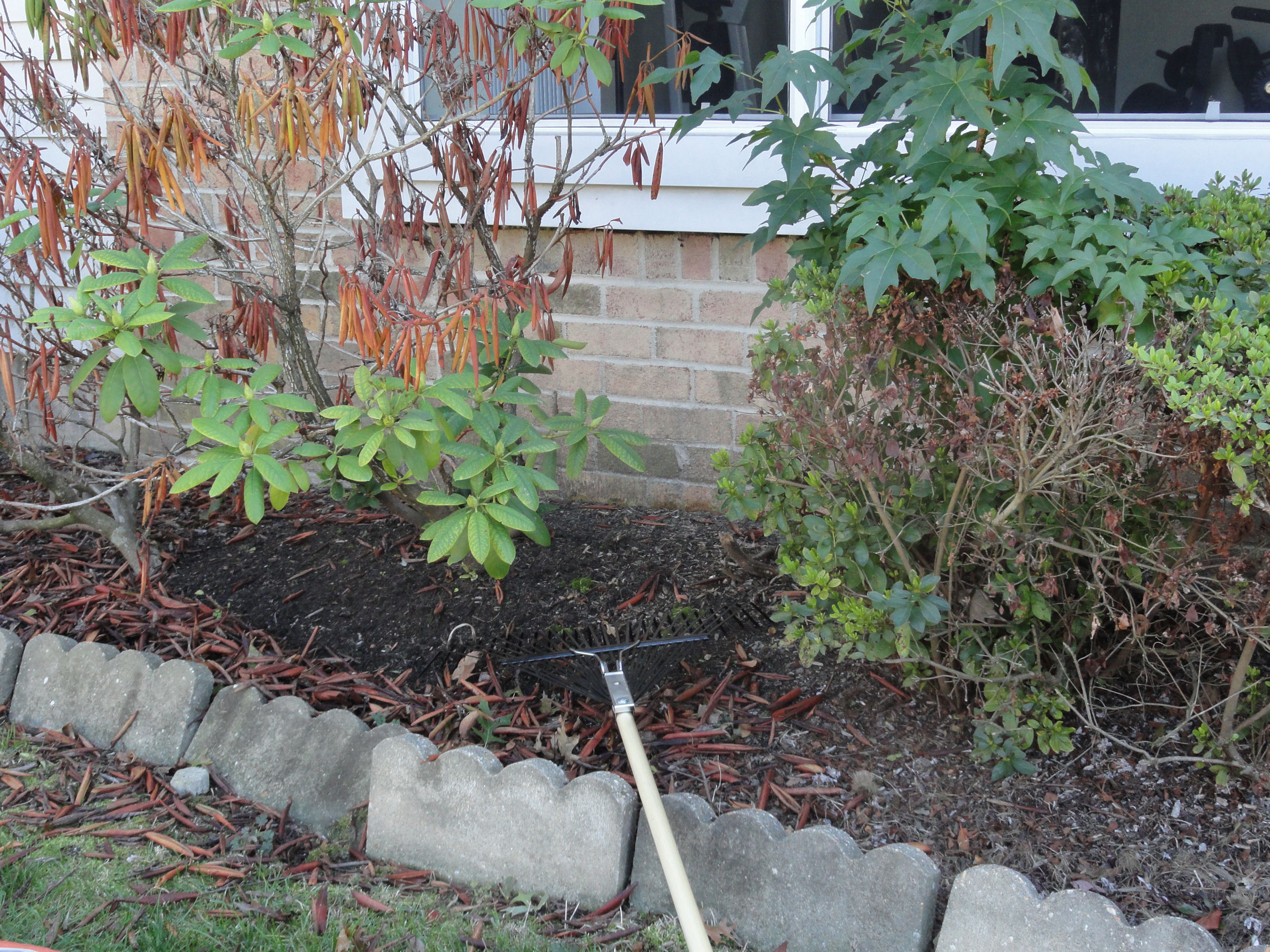We weeded, pruned, raked and added mulch. We also got new brick fence – things. Much prettier! Dave also took a shot at fixing the screen door: