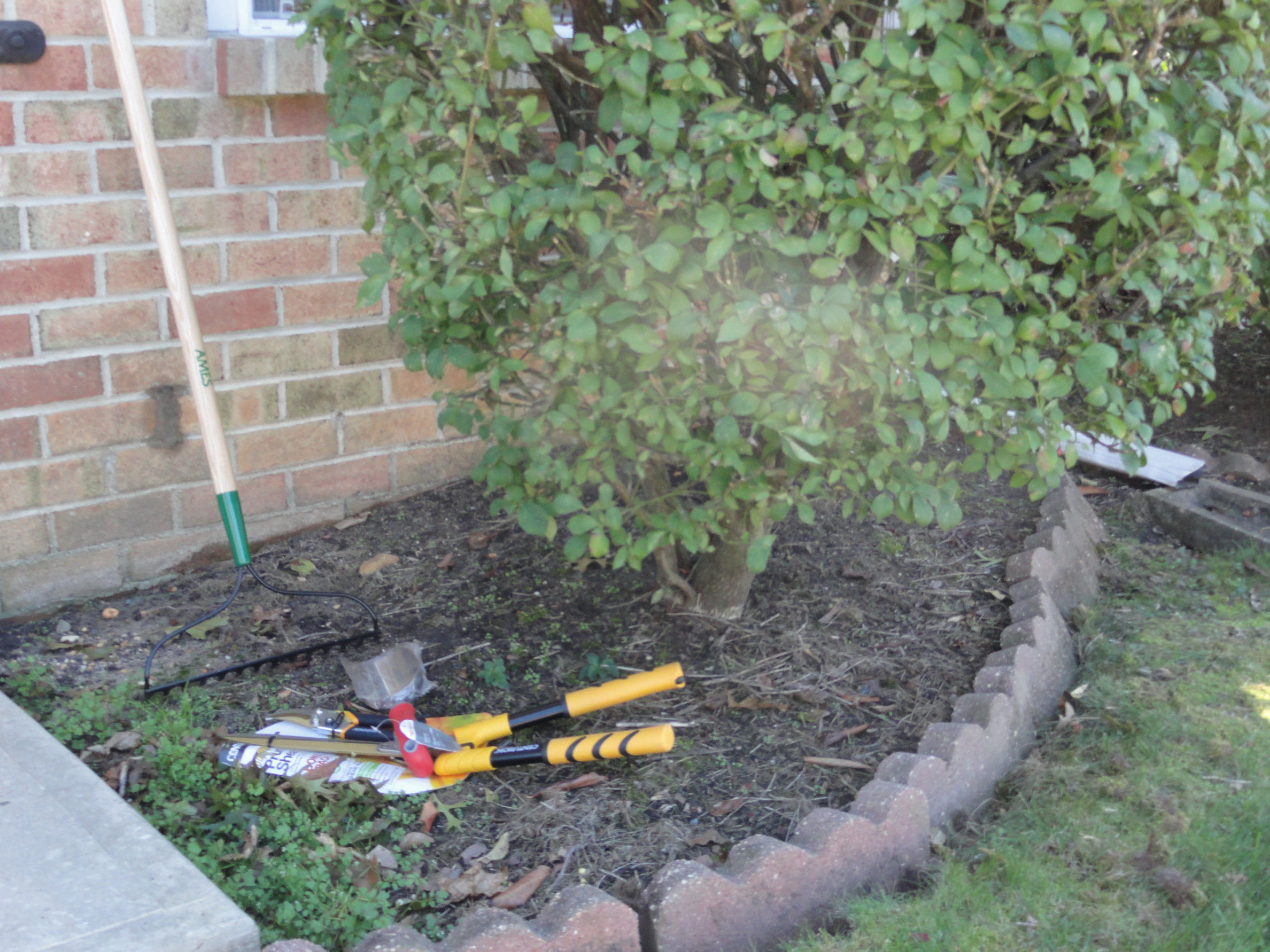 Now that we almost-purchased a new house, it’s time to sell Dave’s house. Looking back, we probably should have started this process a little sooner than now, but oh well. First thing’s first – we need to start with the outside. After two trips – one to Home Depot and the other to Lowe’s, we finally got all of the needed equipment – mulch, brick, shovels, brooms, hose.